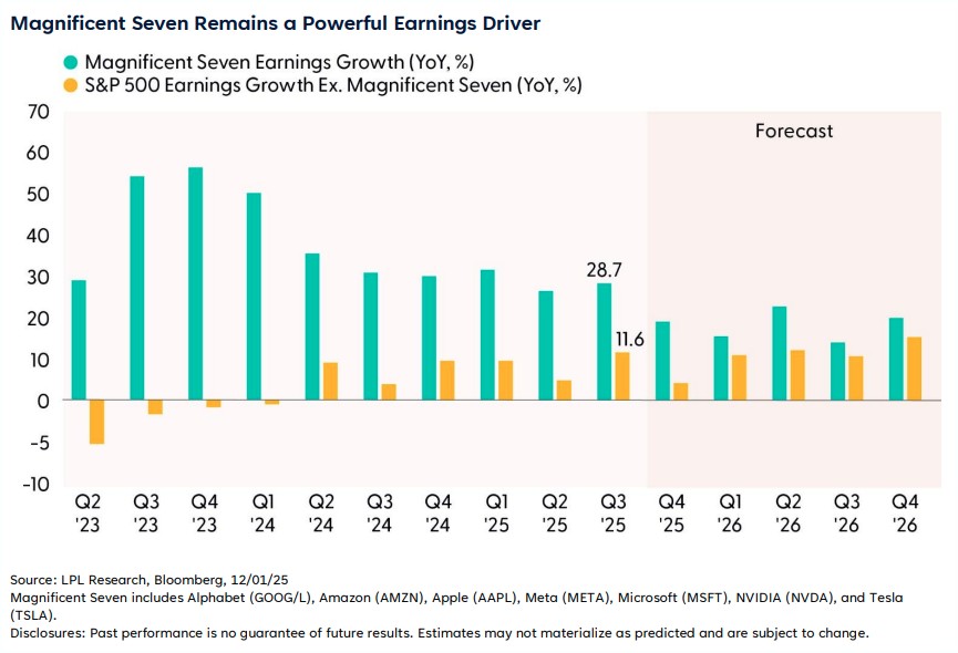 The Magnificent Seven has been responsible for more than half of S&P 500 earnings growth in the past few quarters and will likely continue to play a significant role in growing earnings in 2026. While the wide gap between the Magnificent Seven’s earnings growth and the rest of the market will likely persist well into 2026, supporting large-cap growth stocks, expect this gap to narrow as the year progresses. This is something to watch closely when the calendar turns, as it could spark a market rotation into value stocks.